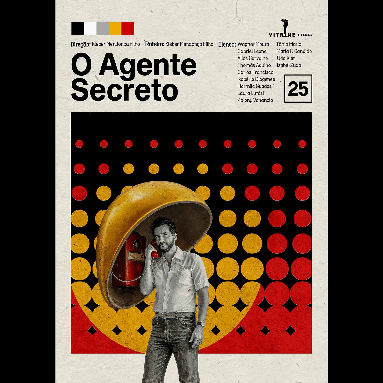 O Pôster Minimalista O Agente Secreto é uma arte inspirada no filme O Agente Secreto, dirigido por Kleber Mendonça Filho, reconhecido internacionalmente e indicado ao Oscar.