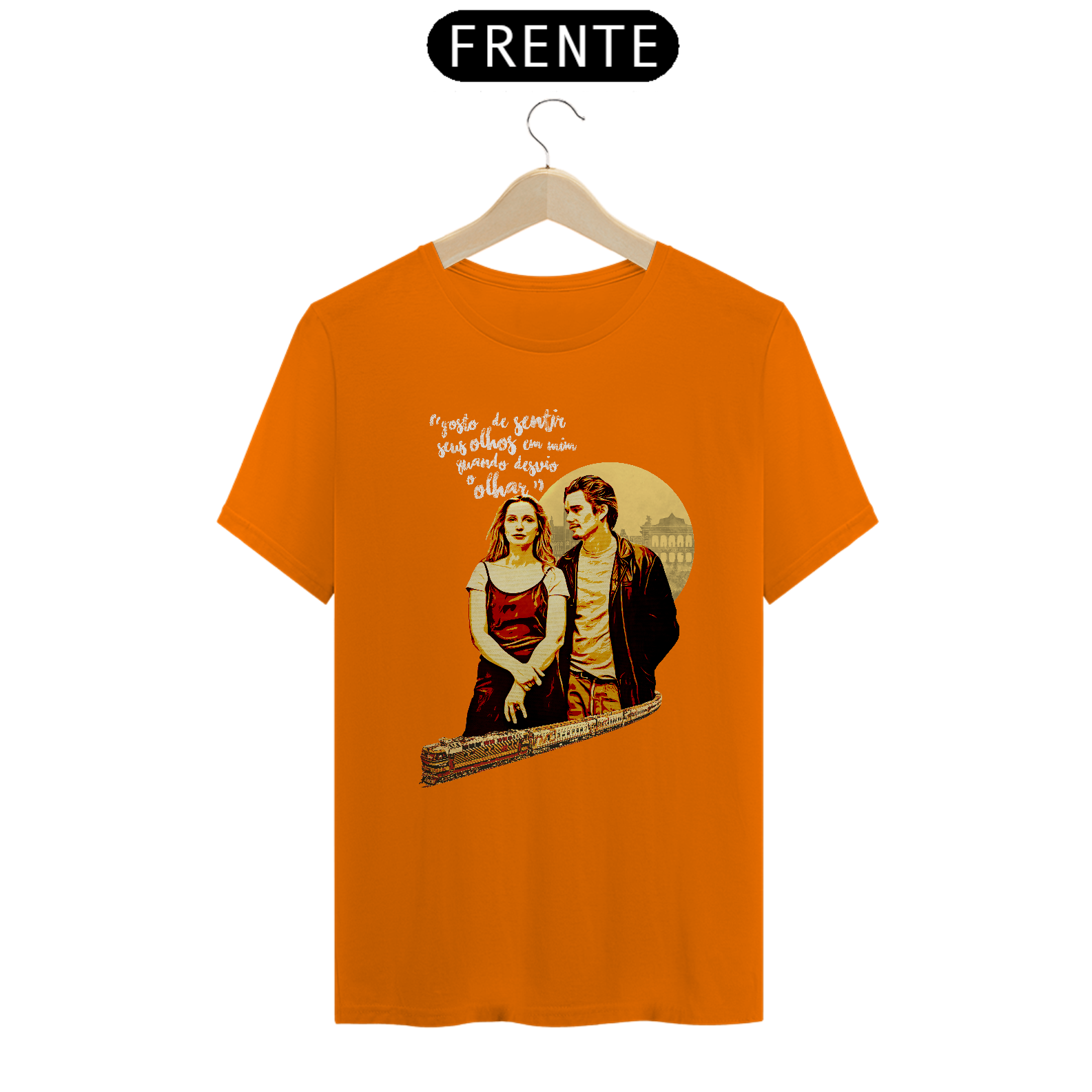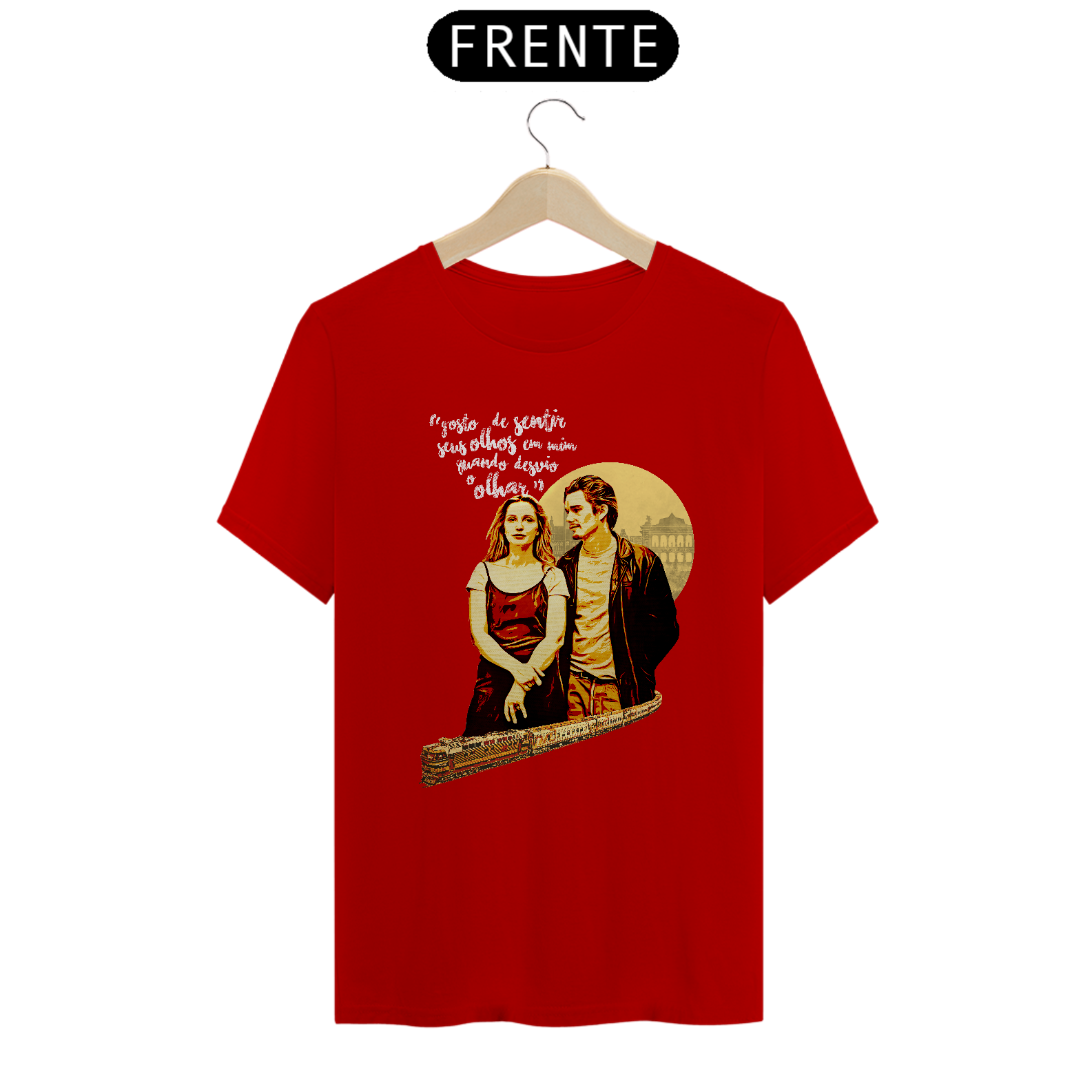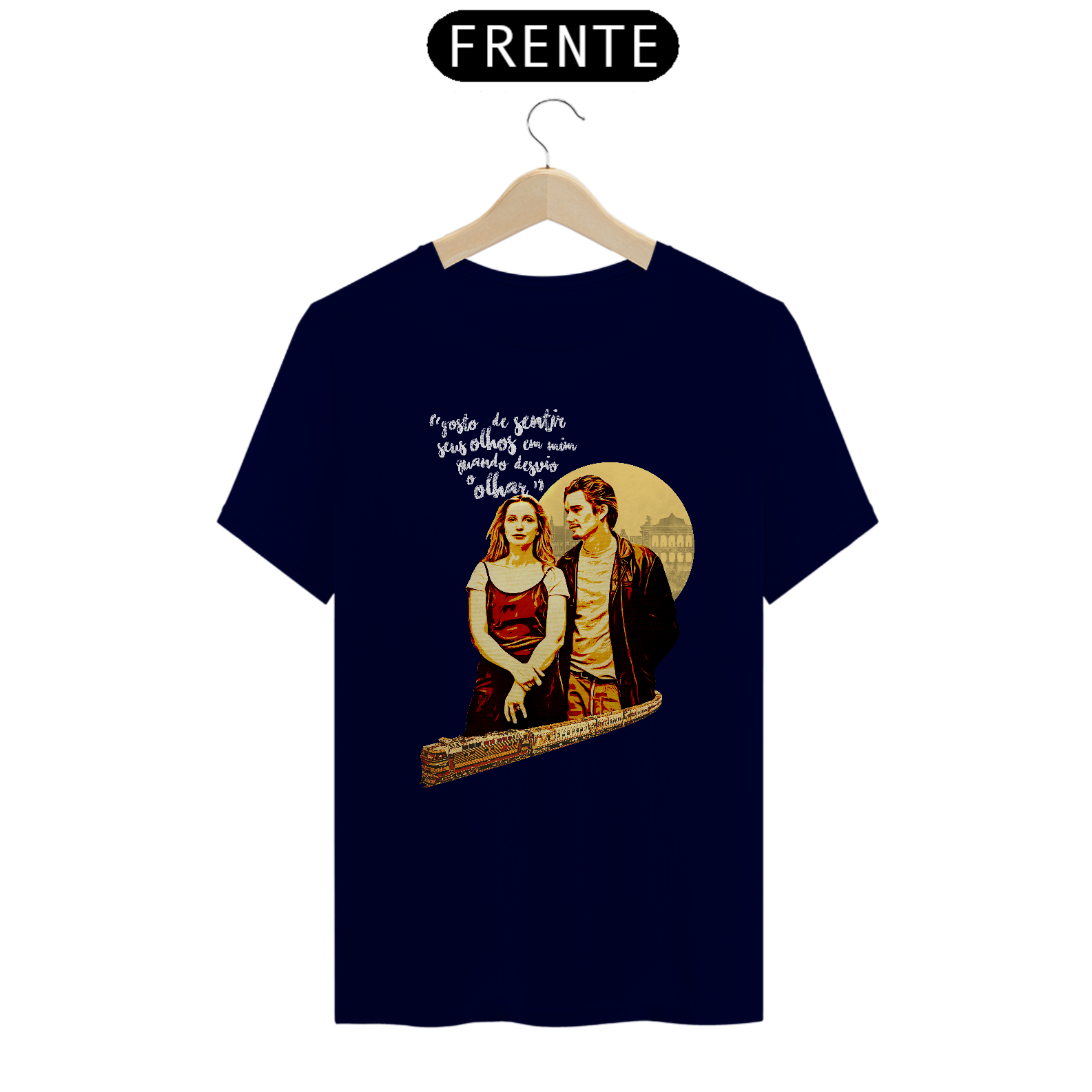 Inspirada no clássico do cinema independente Antes do Amanhecer, esta camiseta traz uma arte exclusiva que captura a essência do encontro entre Jesse e Céline em Viena — diálogos profundos, conexão instantânea e o charme do amor vivido no tempo presente.