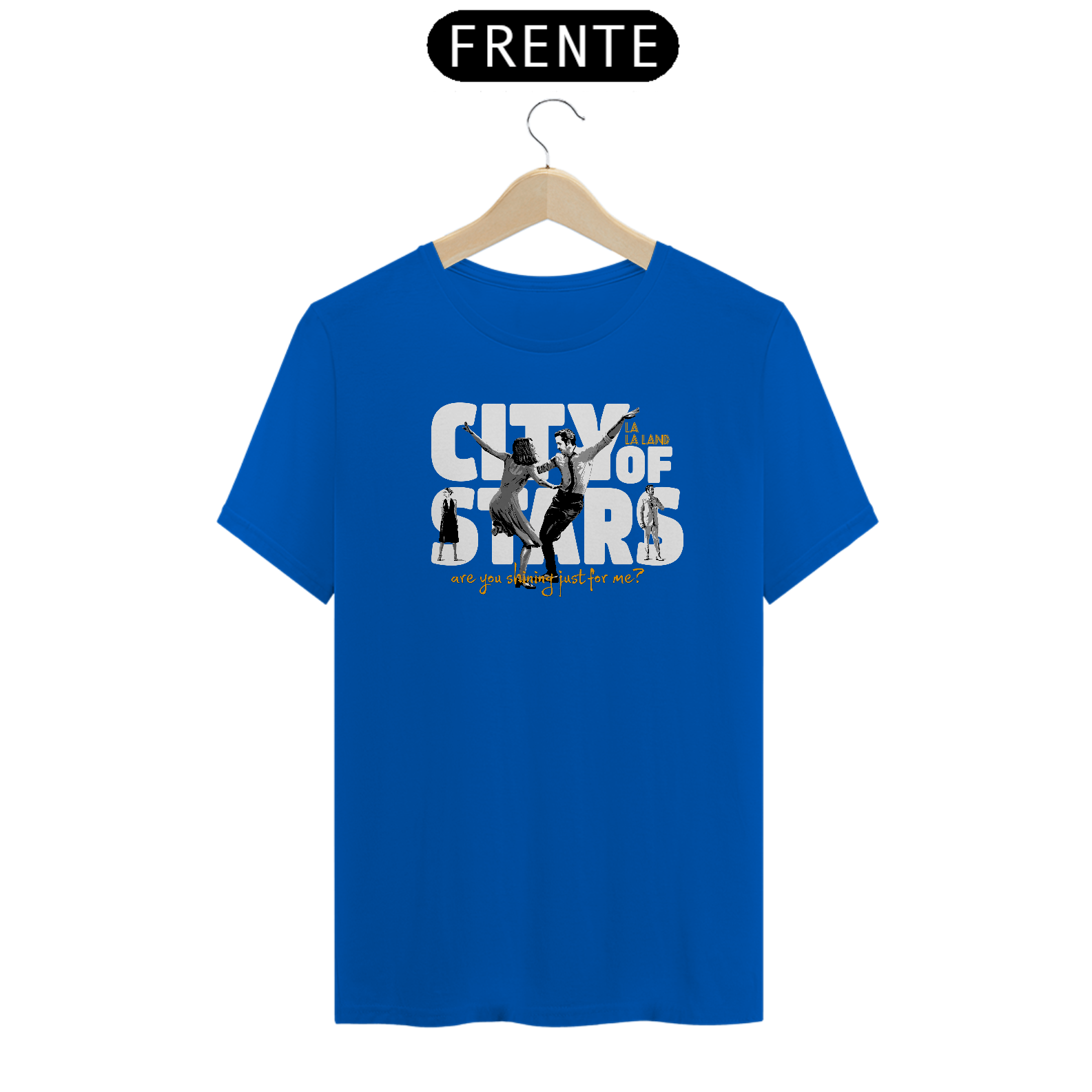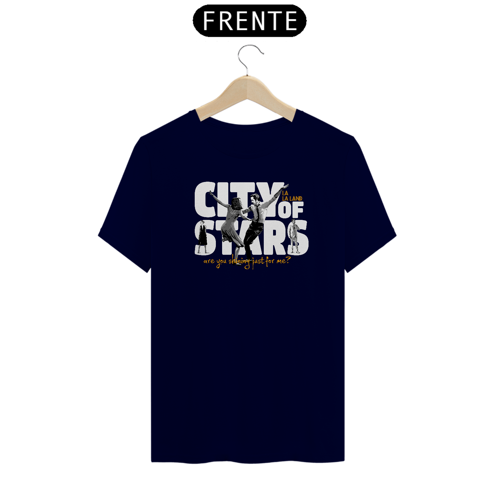 Camiseta inspirada no filme La La Land, um dos musicais contemporâneos mais marcantes do cinema. A estampa traz referência direta à icônica cena de dança de Sebastian e Mia, com destaque para a frase “City of Stars”, símbolo do sonho, da arte e do amor em Los Angeles.