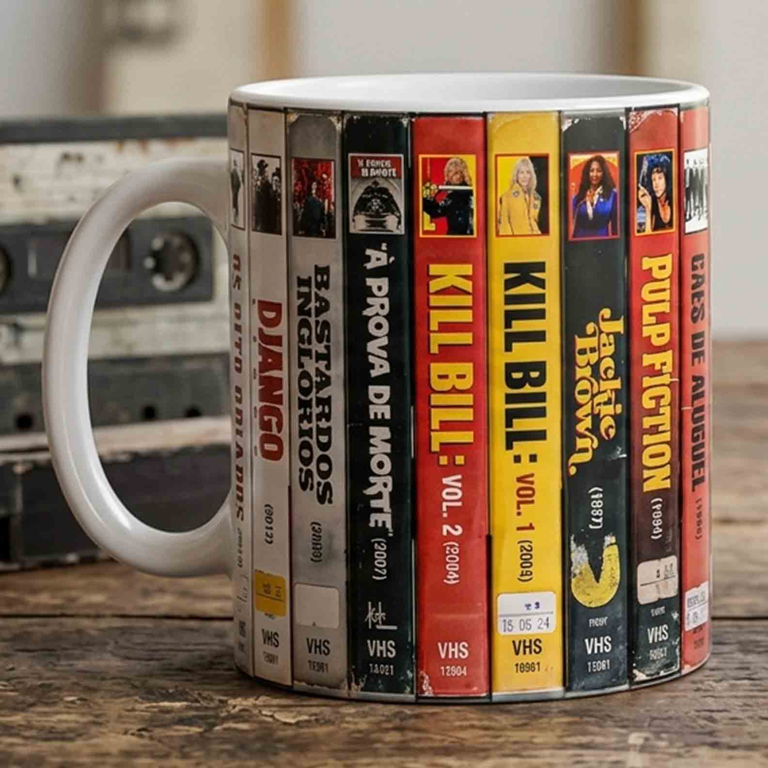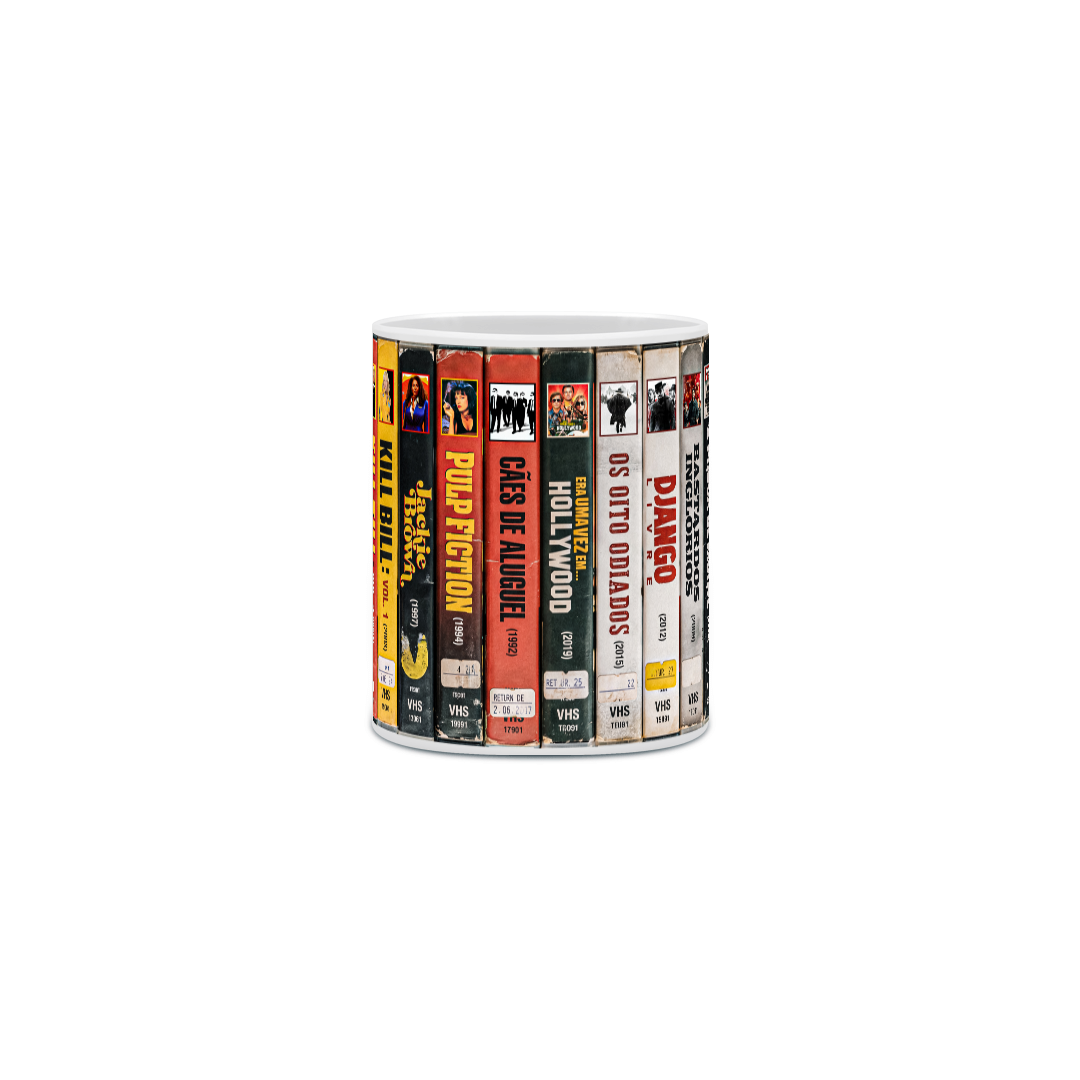 Inspirada no universo de Quentin Tarantino, esta caneca traduz o diretor menos como assinatura e mais como estante: uma sequência de lombadas VHS gastas, cores saturadas e títulos que ajudaram a transformar violência, ironia e cultura pop em linguagem cinematográfica. A arte reúne filmes como Pulp Fiction, Kill Bill, Jackie Brown, Django Livre, Os Oito Odiados, Bastardos Inglórios, Cães de Aluguel e Era Uma Vez em... Hollywood em uma composição que parece saída de uma locadora imaginária onde o tempo parou no melhor momento possível.
