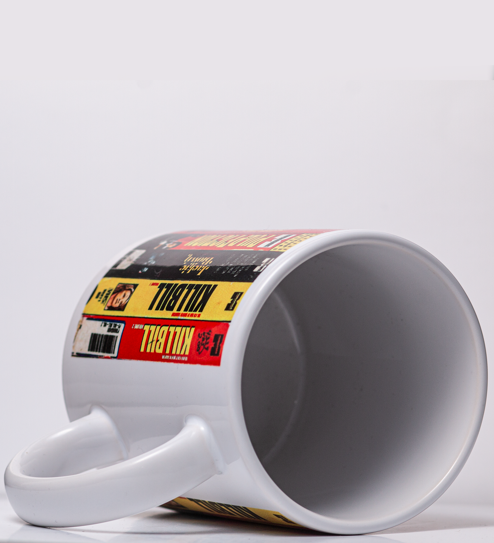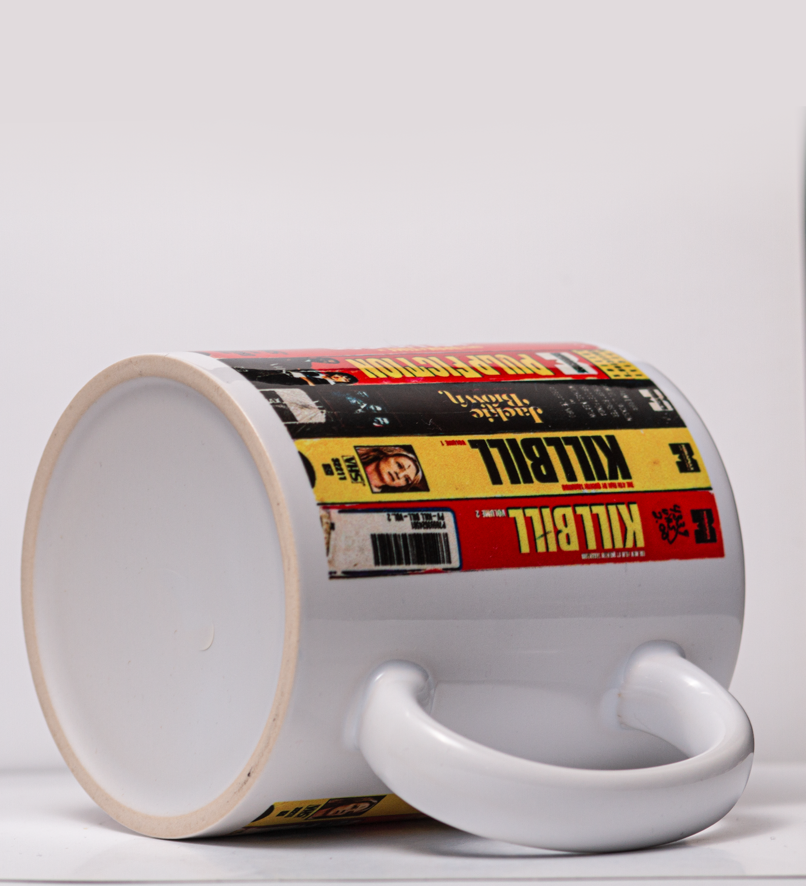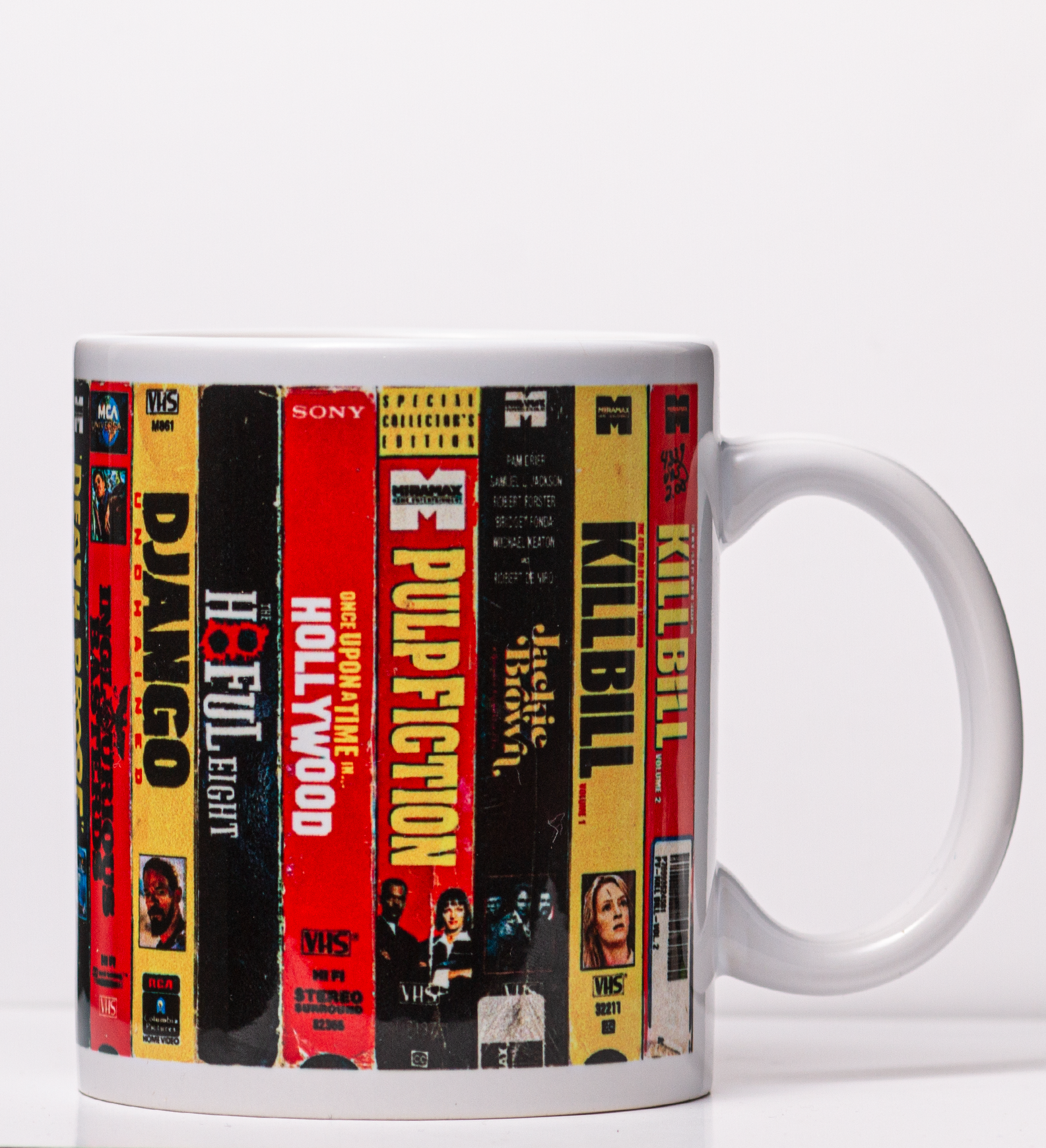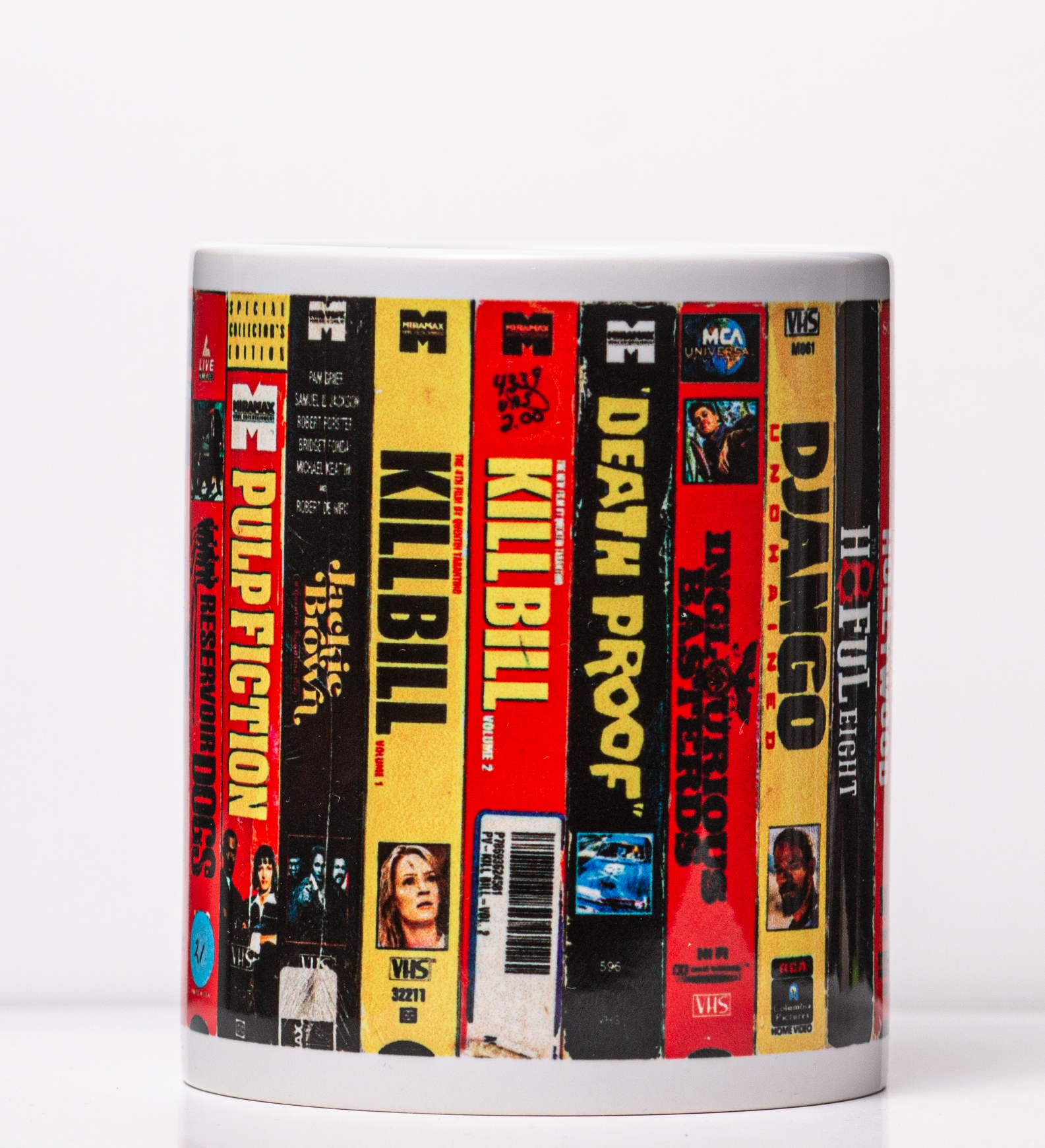 Caneca com os 1 filmes do Quentin Tarantino, em formato VHS de Locadora.