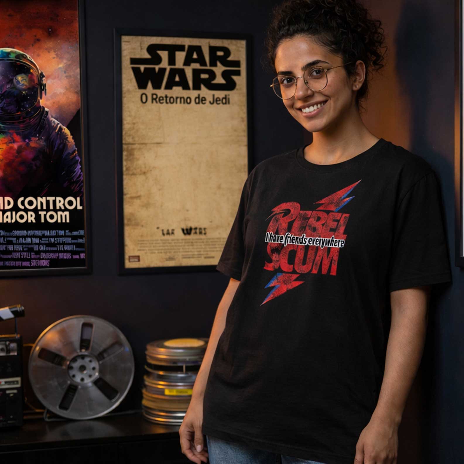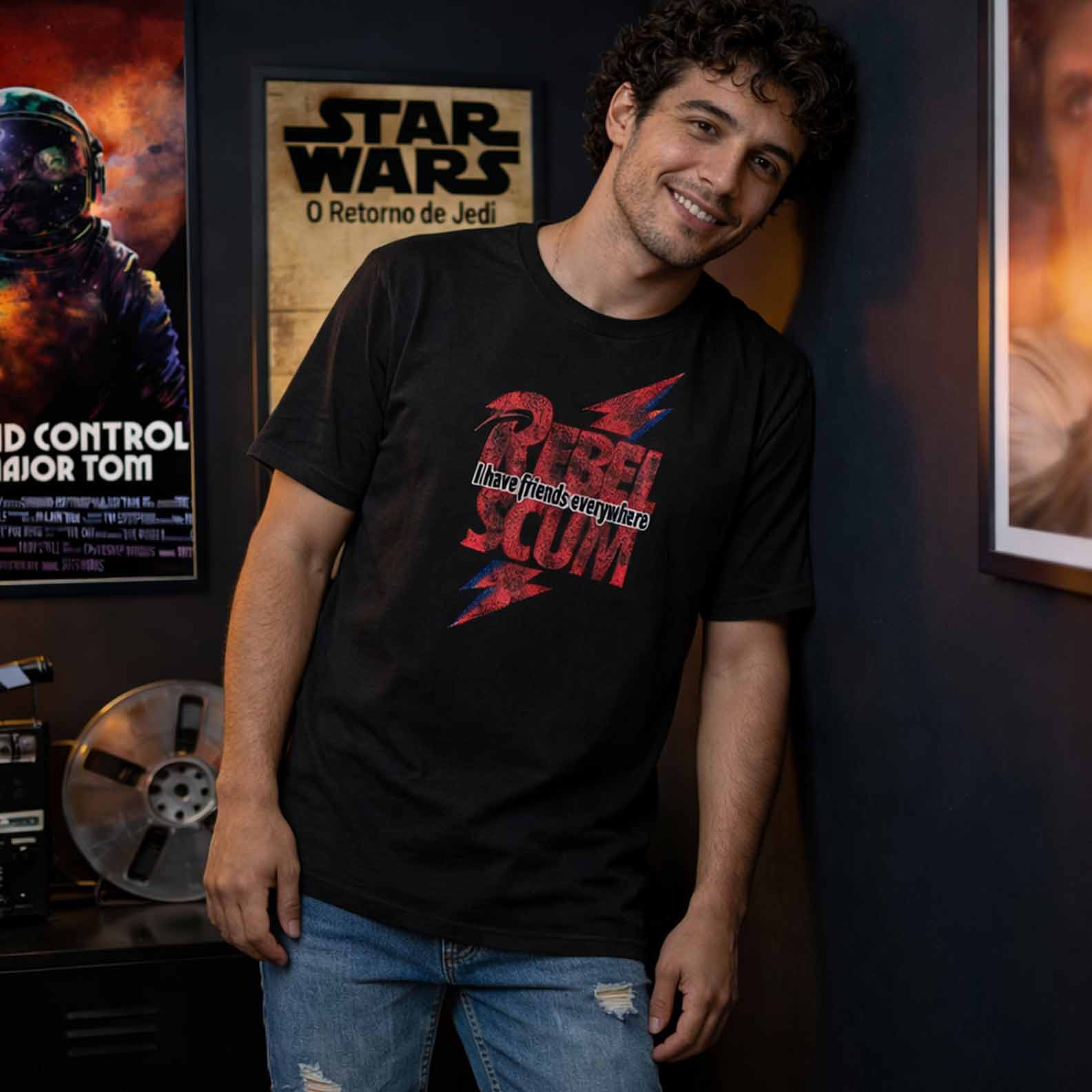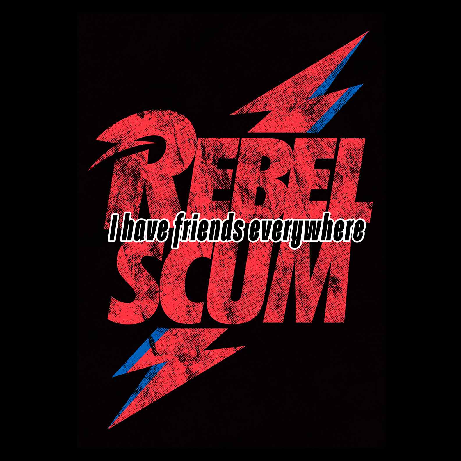 O termo Rebel Scum, originalmente usado como insulto pelo Império, é resgatado aqui como símbolo de orgulho, resistência e identidade — especialmente para fãs de produções como Rogue One. O visual em raio vermelho e azul faz referência direta à estética icônica de Bowie, conectando música, cinema e contracultura em uma única linguagem visual.